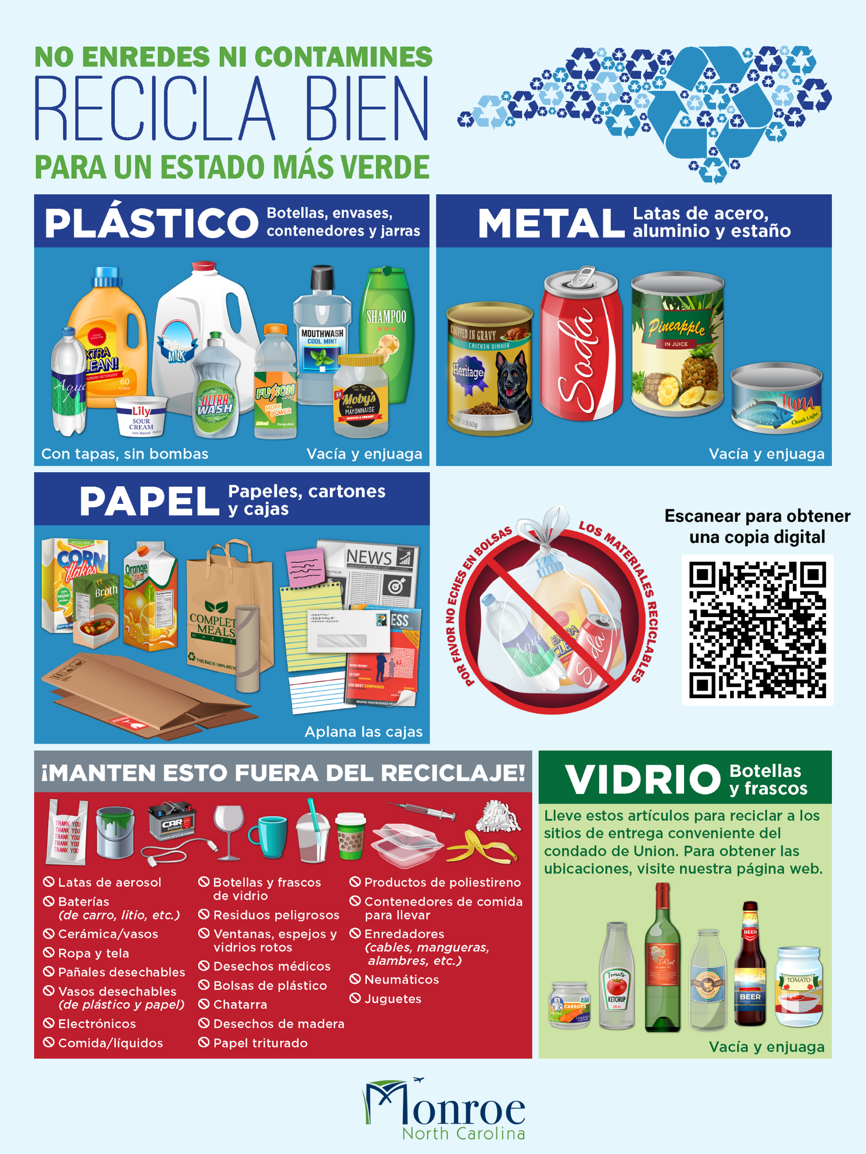 The City of Monroe provides recycling collection for our residents every other week on the same day as your garbage collection. Please use your 96-gallon black recycling cart only for the items we accept in our program. Items should be placed in your recycling cart loose and not contained in a plastic bag.